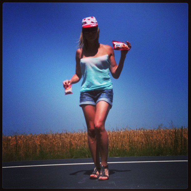 12h50 : installation dans un tout petit coin d’ombre, dans un fossé et pause pique nique entre deux familles. Des véhicules sécurité et publicitaires commencent à faire des allers et venues devant nous.