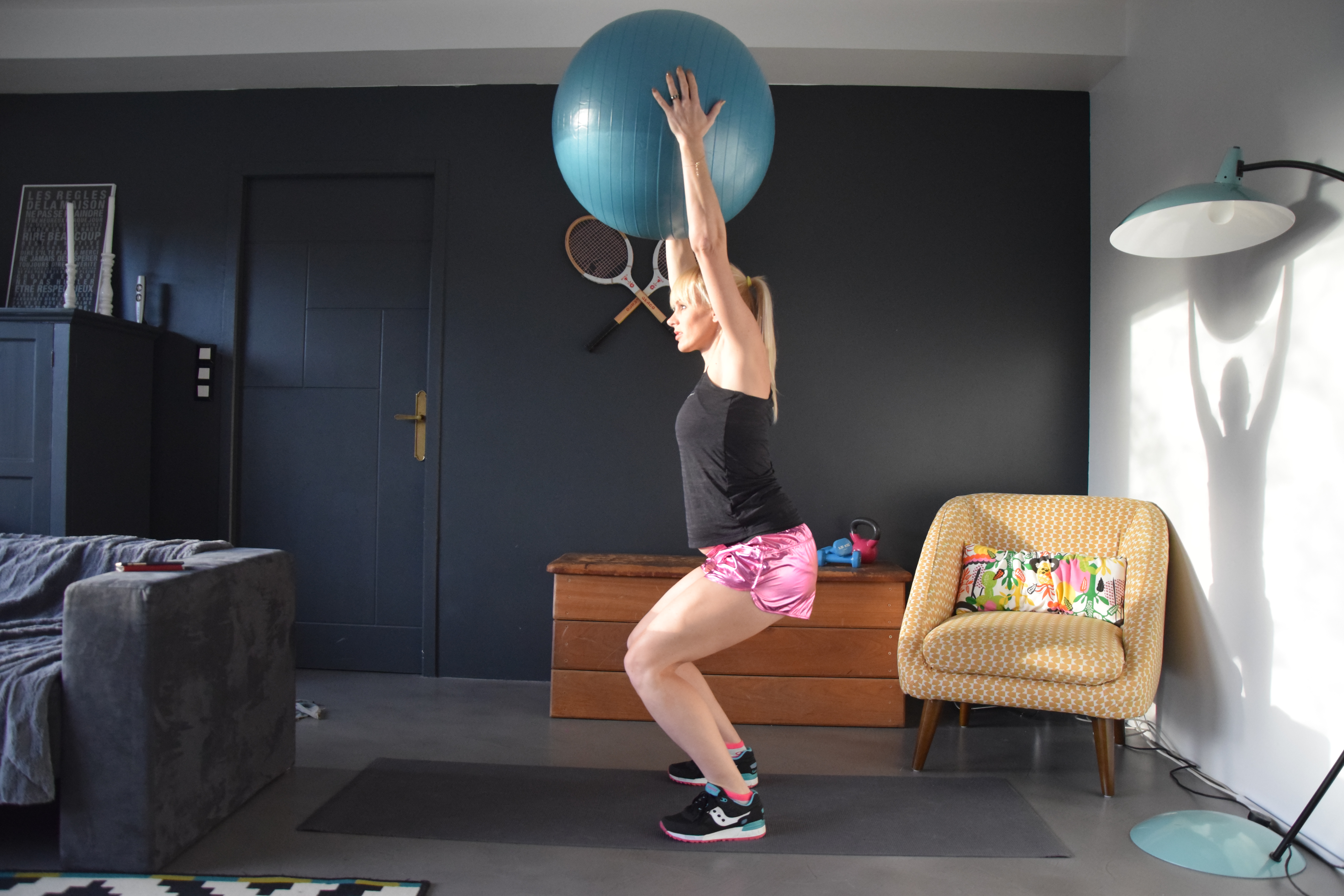 Debout, pieds écartés à la largeur du bassin, je tiens mon swiss ball devant moi. je plie les genoux en squat en montant le ballon au dessus de ma tête.