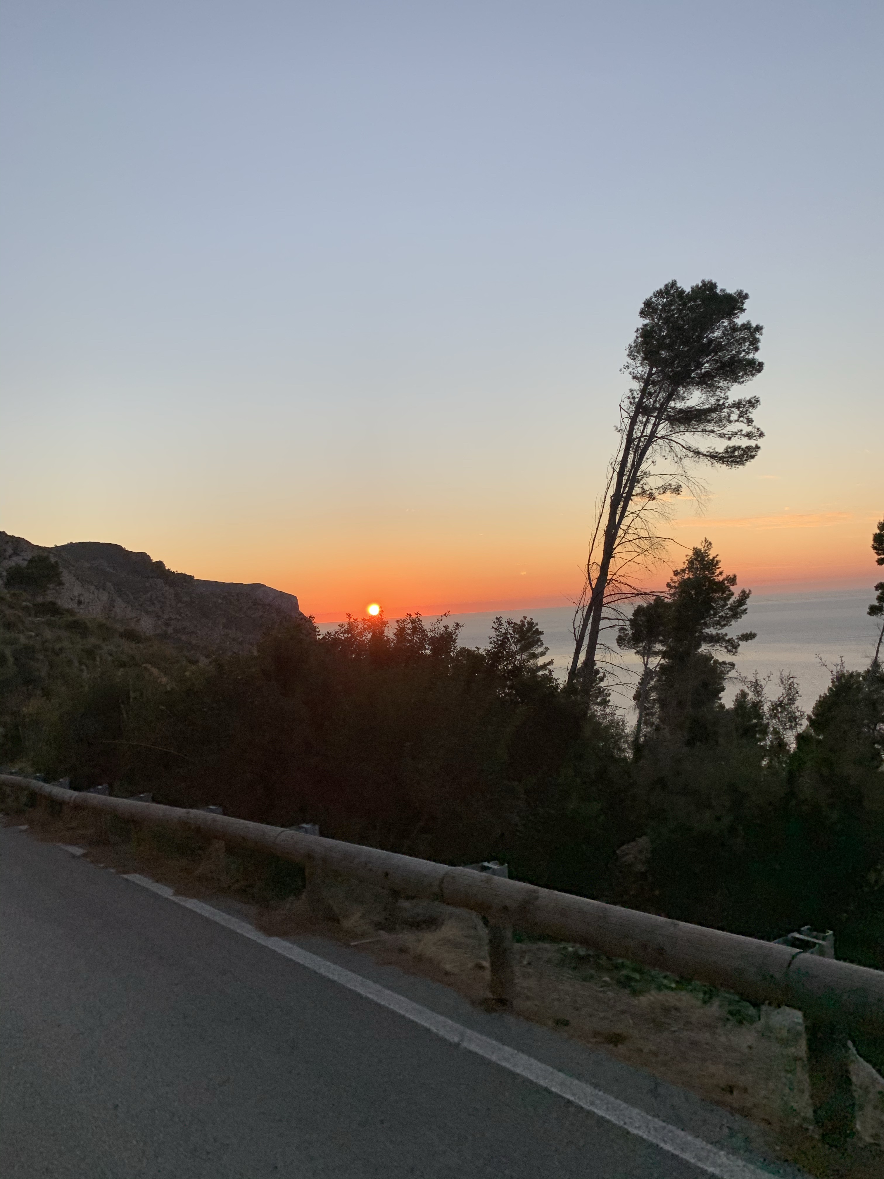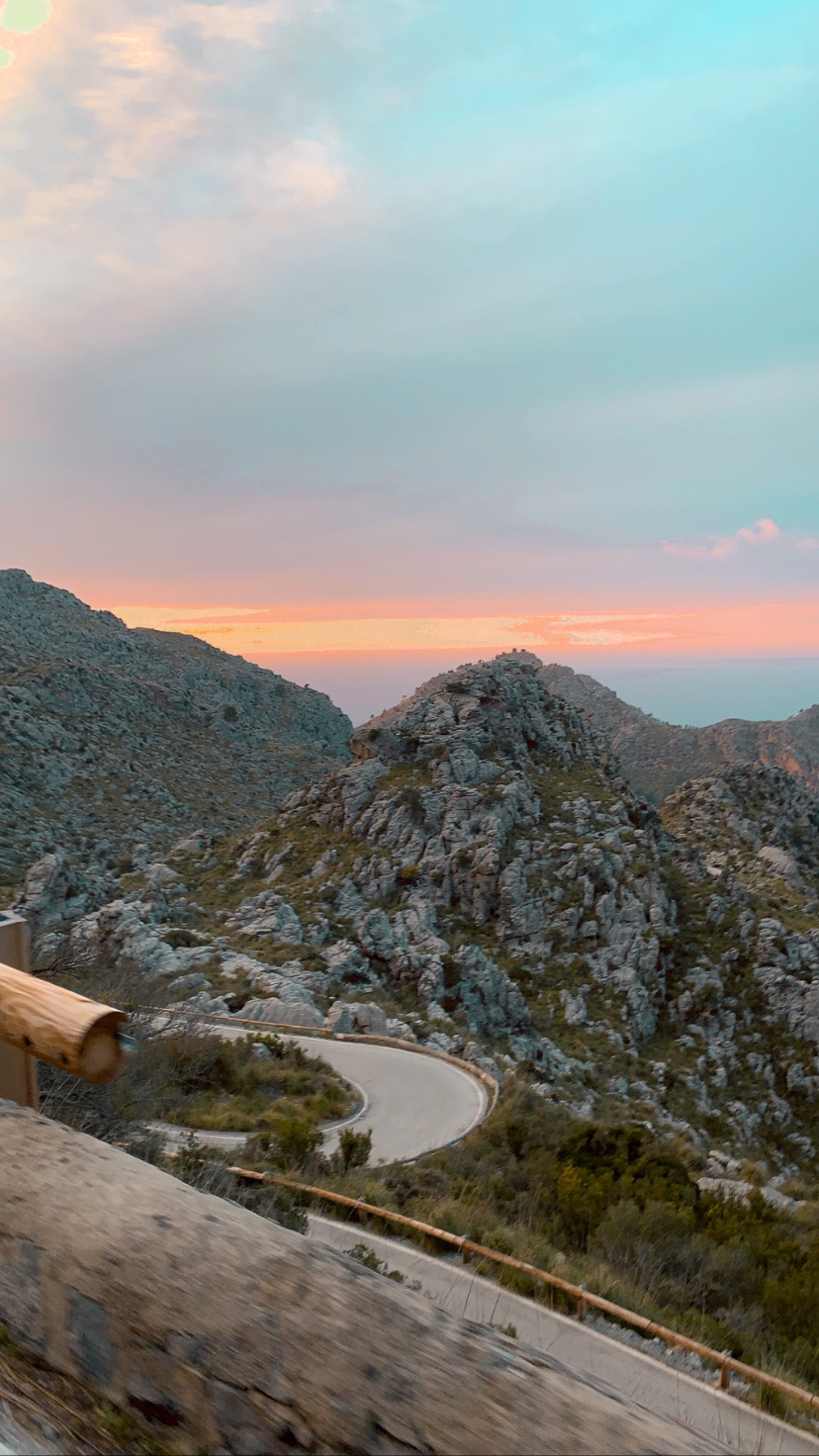 Nous montons ensuite jusqu’à Van près de Lluc. À ce moment nous hésitons à nous arrêter en route pour faire l’Ascension à vélo mais finalement nous ferons le bon choix on regarde leur déjà tardive pour aller s’attaquer à Sa Calobra. En effet la route est déjà une vraie étape en soi pour arriver jusqu’à Luc notre point de départ et nous filons donc vers cette route mythique qui figure en tête des ascension affaire à Majorque. Nous montons donc jusqu’au Col Del reis a 682m d’altitude. Et là haut nous tombons ébahis sur le spectacle de cette route et ses lacets en descente au creux des montagnes juste hallucinante. descendre en vélo et ta maman exceptionnelle que j’en ai presque les larmes aux yeux. Arrivés en bas il est déjà tard, Il faut remonter au plus vite. L’ascension se faut sous des couleurs de Sunset d’un rose incroyable qui se réverbère sur les monts de roche blanche. En haut, je suis un peu séchée, faute d’alimentation j’ai du Faire une petite hypoglycémie. Nous filons au milieu des montagnes dans la nuit noire avec quelques lumières sur le vélo de Yo pour rejoindre notre van . Un peu de courage encore pour la douche gelée, tous nus au cul du camion dans cette Pénombre montagneuse , puis nous prenons la route de Port Soller.
