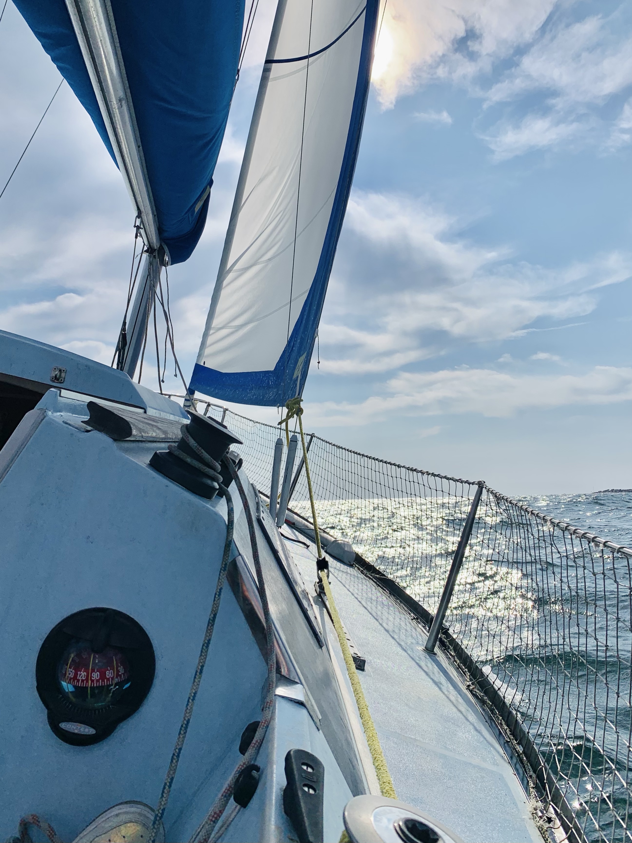 La mer est belle, avec une légère houle et une moyenne de 16 à 18 noeuds de vent. La grande voile et le génois nous portent bien et nous ferons une traversée efficace avec une allure globale de presque 6 noeuds. Descendre en cabine me donne la nausée et notre cher Gus se révèle être un cuisto de bord hors pair, dont nous sommes ravis de profiter. Après environ 5 heures de traversée au portant avec une visibilité moyenne, nous apercevons au loin sur l’eau une forme brumeuse, L’Ile se dessine devant nos yeux presque comme un mirage. La houle s’intensifie et il m’est préférable de prendre la barre et bien regarder en avant du bateau. C’est une excellente excuse pour me retrouver, avec excitation et non sans frousse masquée, seule à la barre pendant une petite demi heure de sieste de mes équipiers.