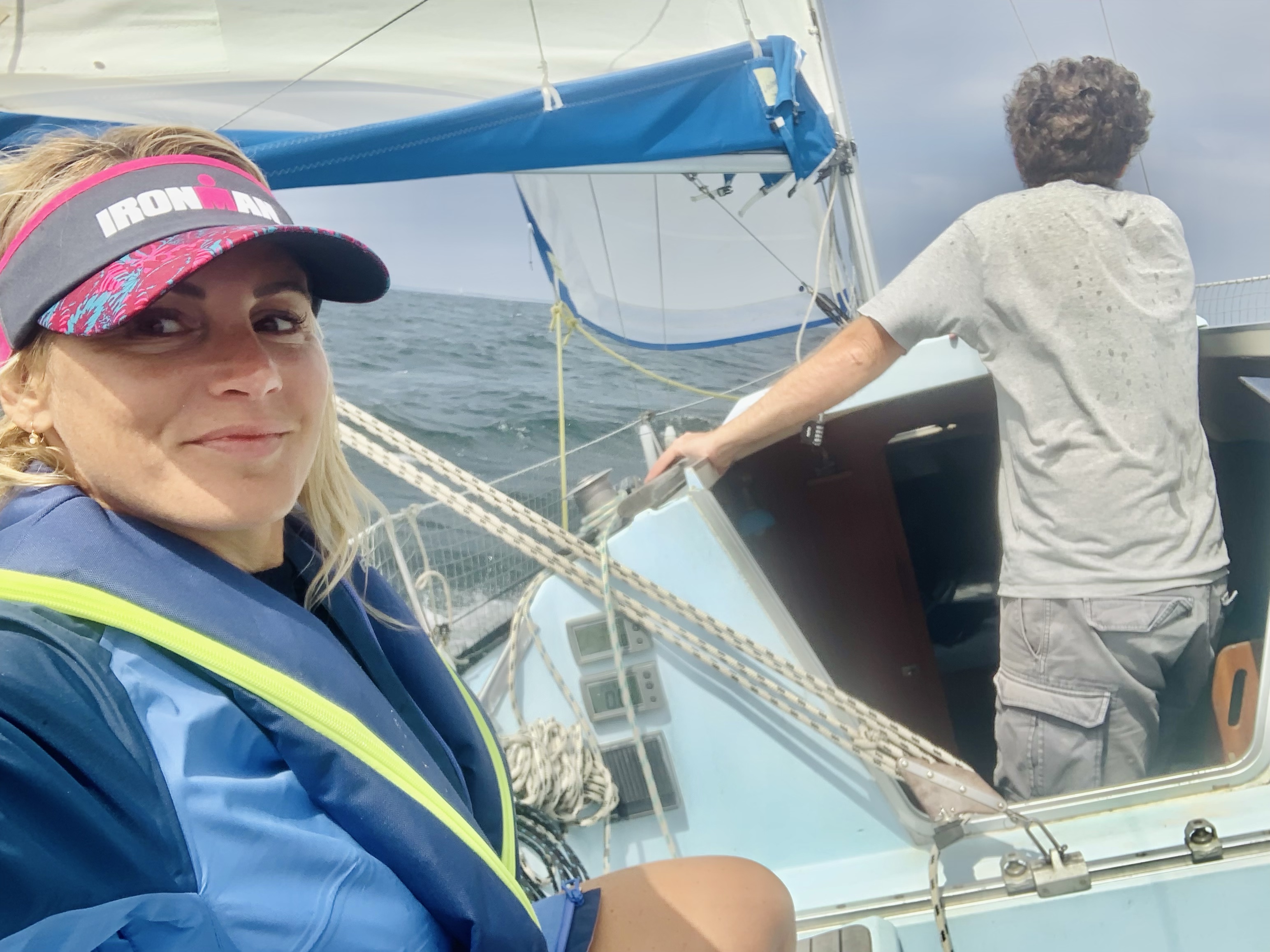 Nous sommes dans le chenal, puis nous hissons les voiles et coupons le moteur enfin, notre traversée peut débuter.