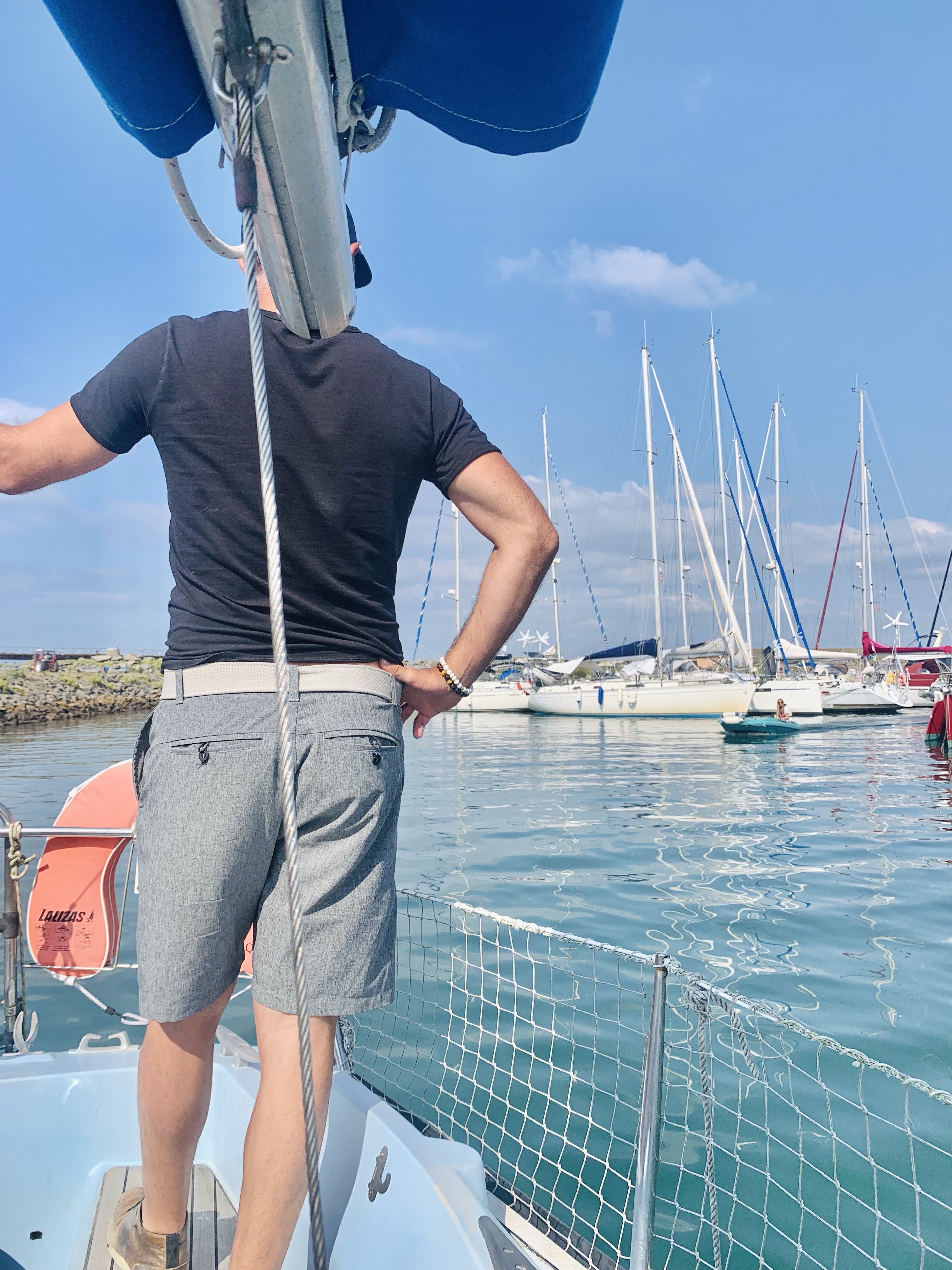 Mardi matin, nous sommes prêts et le soleil nous attends. Sous la pression du moment et avec ce vent qui rabat mon bateau sur le ponton, j’exécute la manœuvre de sortie la pire jamais réalisée et fort heureusement mes deux équipiers assurent le voilier.